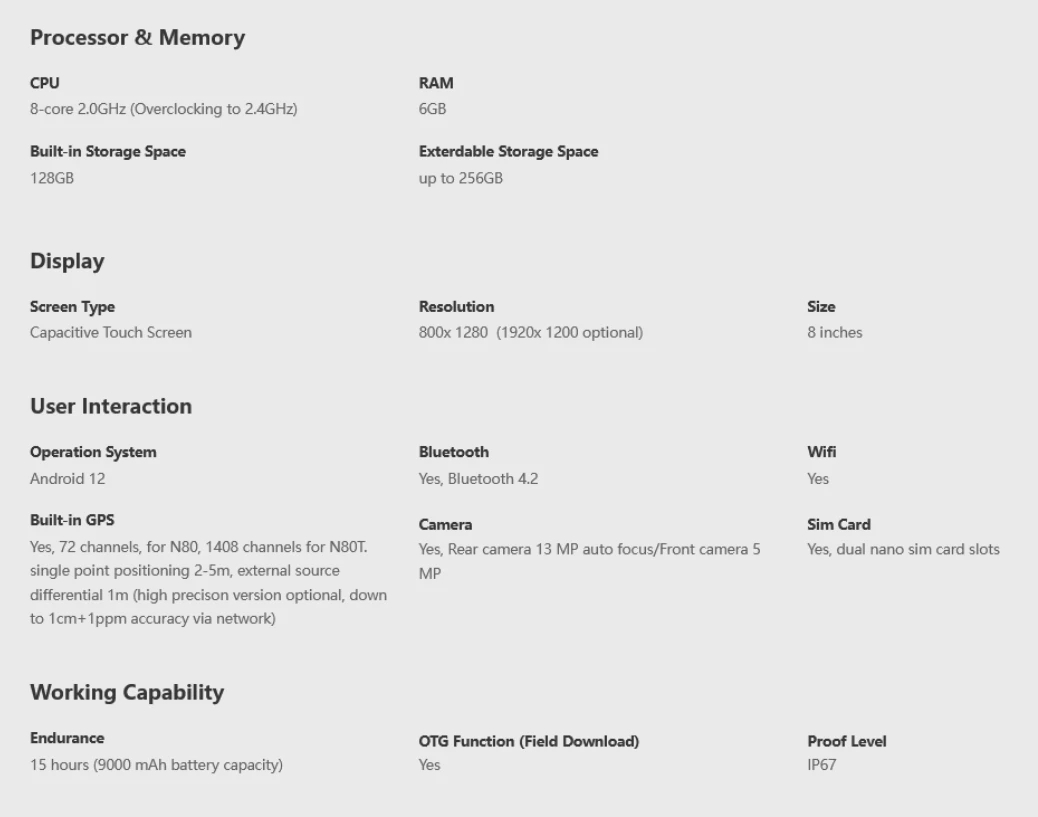 Zahvaljujući 2,4 GHz CPU-u i 6 GB RAM-a, N80 može vrlo dobro pokretati Android aplikacije kao što su LBS, survX, Ksurvey, EGSTAR i GISTAR. Odvojiva baterija od 9000 mAh omogućuje 15 sati korištenja. Zaslon od 8 inča može prikazati više informacija tijekom snimanja. Stražnja kamera od 13 MP i prednja kamera od 5 MP mogu snimati slike visoke rezolucije.